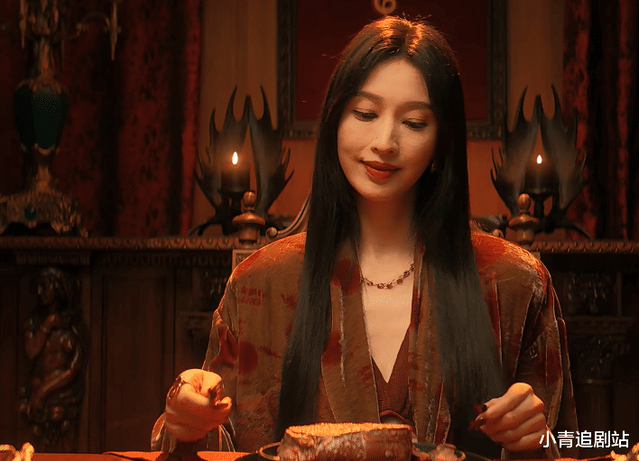 坐下之后,她开始吃饭,用刀叉切着面前一块,就表皮是焦的,里面全是生的肉,那种品味美味的模样,更像吸血鬼了。